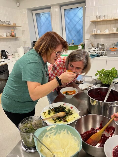 W kuchni było wyjątkowo gwarno. Oprócz naszych warsztatów, z przestrzeni skorzystało też zaprzyjaźnione stowarzyszenie, które wraz ze swoimi seniorami realizowało działania projektowe w duchu zero waste- z zebranych owoców i warzyw robili pyszne przetwory na zimę.